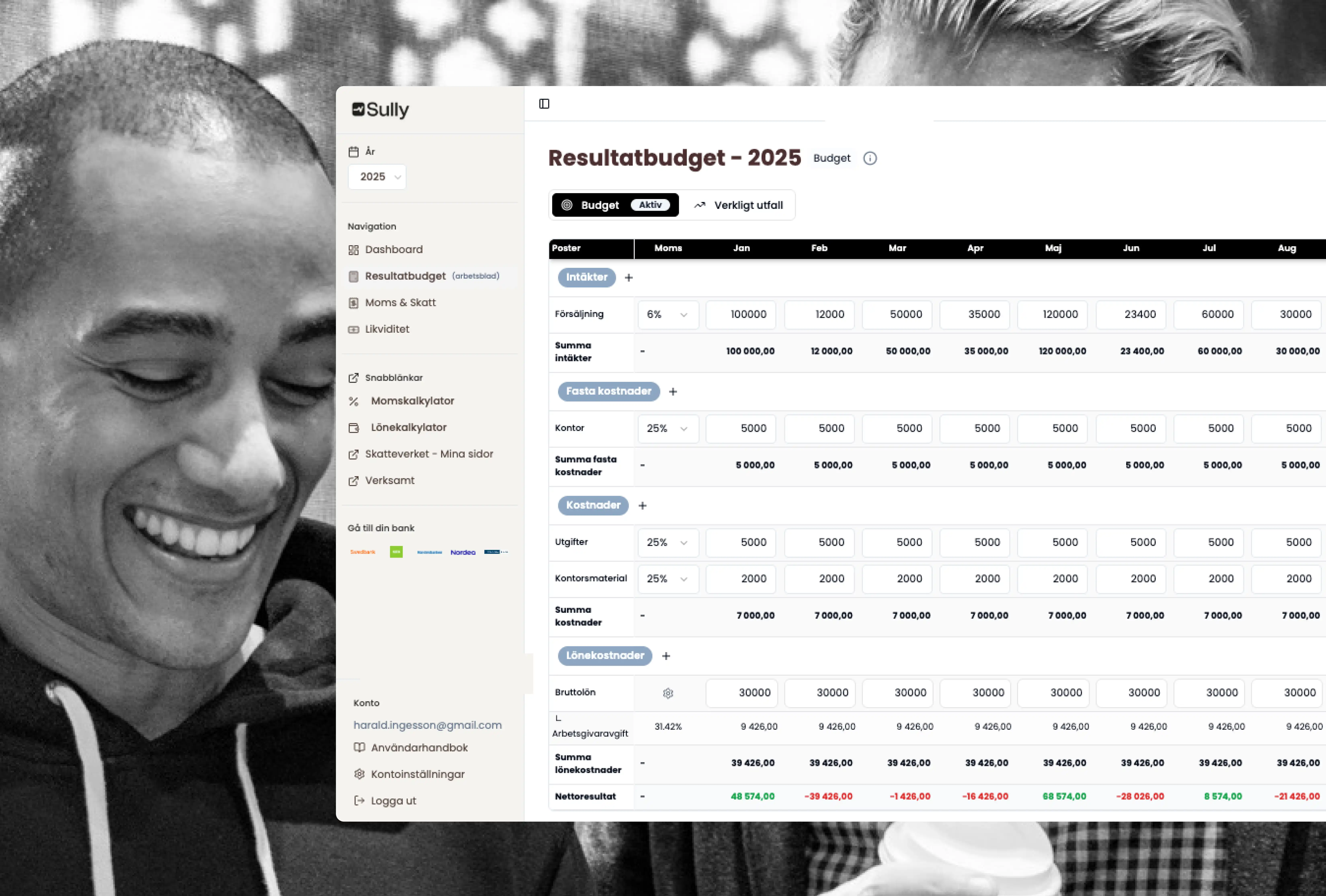 Se direkt hur intäkter, kostnader och lön påverkar resultatet. Sully räknar åt dig och ger en tydlig överblick.